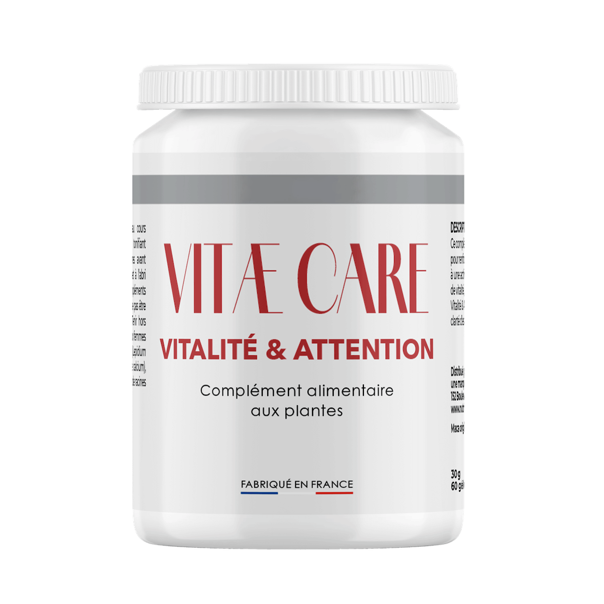 Vitae Care Vitalité & Attention associe plusieurs plantes reconnues pour leurs propriétés énergisantes et favorisant la concentration. L’éleuthérocoque, plante adaptogène, contribue à une activité mentale et cognitive optimale. La maca aide à maintenir un sentiment de vitalité, de bien-être physique et mental ; elle est aussi appelée “ginseng péruvien”. Ce complément alimentaire contient également de la caféine via la noix de cola et du gingembre aux vertus stimulantes et toniques qui contribuent à la résistance contre la fatigue.