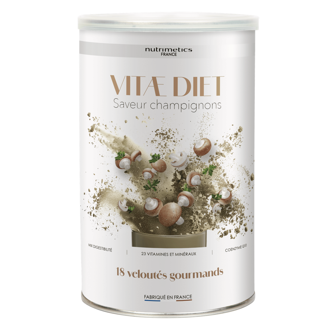 Vitae Diet saveur Champignons est un repas gourmand fabriqué en France, véritable alternative pratique et savoureuse pour remplacer un repas classique. Ce velouté contient des protéines, des fibres, et est enrichi en vitamines, minéraux essentiels ainsi qu’en coenzyme Q10, reconnu pour son rôle dans le métabolisme énergétique. Parfait pour les journées chargées et animées, il est facile à préparer et à emporter et disponible dans une variété de saveurs sucrées et salées.